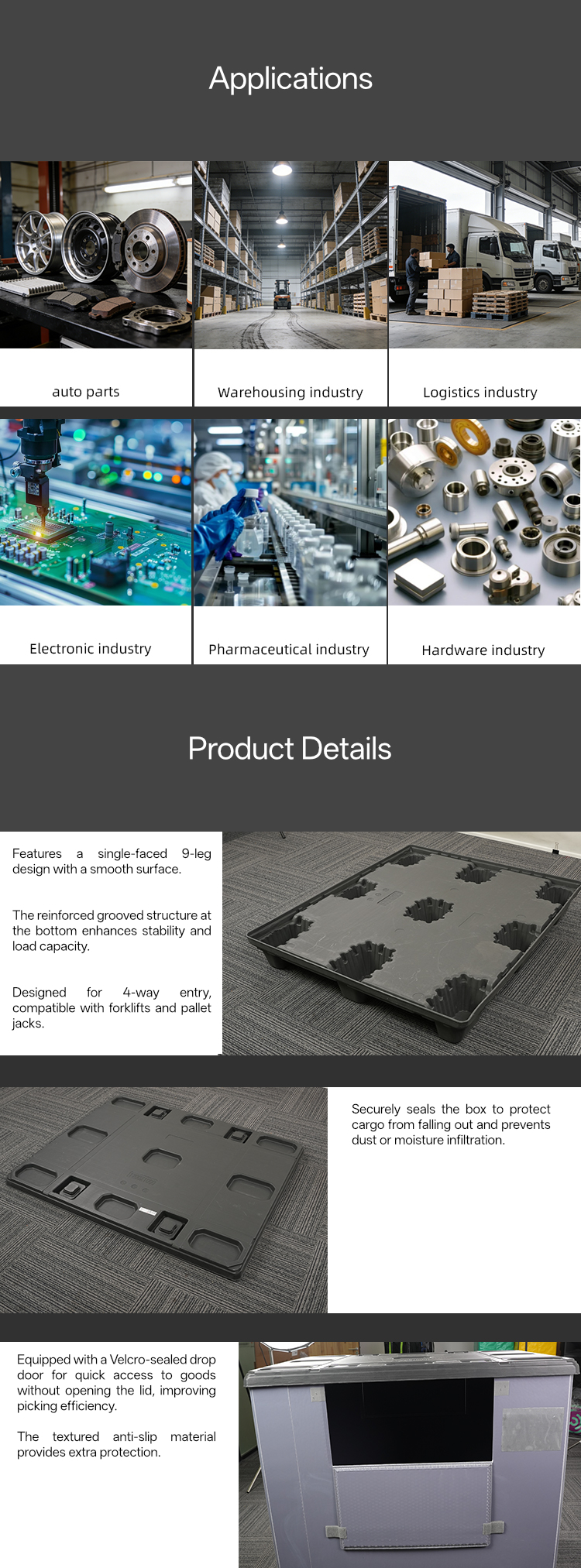 สำหรับ อุตสาหกรรมอิเล็กทรอนิกส์และเซมิคอนดักเตอร์ที่มีความแม่นยำสูง กล่องพาเลทเหล่านี้ให้สภาพแวดล้อมที่มั่นคงและป้องกันไฟฟ้าสถิต โครงสร้างซี่เหล็กที่ฐาน 9 ขาช่วยลดการสั่นสะเทือนระหว่างการขนส่ง ปกป้องแผงวงจรพิมพ์ (PCB) และเซ็นเซอร์ที่บอบบาง นอกจากนี้ เนื่องจากตัวกล่องกันฝุ่น จึงป้องกันไม่ให้ฝุ่นละอองขนาดเล็กเข้าไปในส่วนประกอบที่ไวต่อฝุ่น ซึ่งเป็นข้อกำหนดที่สำคัญสำหรับการรักษาอัตราผลผลิตสูงในการผลิตอุปกรณ์อิเล็กทรอนิกส์